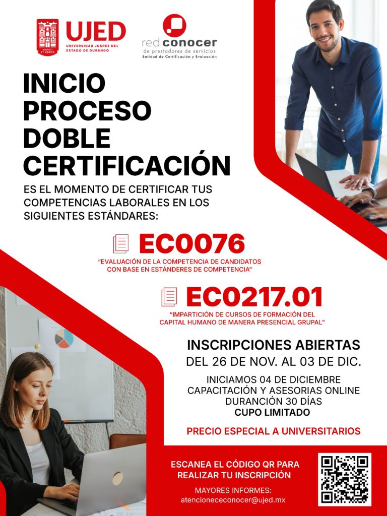 Somos el Área de Certificación CONOCER de la Universidad Juárez del Estado de Durango (UJED), dedicada a evaluar y certificar competencias laborales con validez oficial ante la SEP. Nuestro objetivo es impulsar el desarrollo profesional mediante procesos de capacitación y certificación reconocidos a nivel nacional.